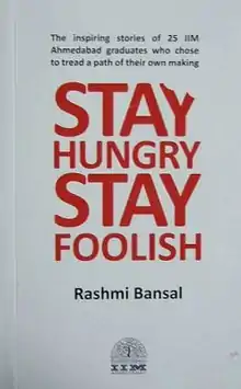 Stay Hungry Stay Foolish is a 2008 book by the Indian non-fiction author Rashmi Bansal. Stay Hungry Stay Foolish created a new record in Indian publishing by selling over 300,000 copies and has been translated into eight languages.[1] Stay Hungry Stay Foolish is a famous quote of American business magnate Steve Jobs[2] which he originally took from last page of the Whole Earth Catalog published in October 1974.[3]