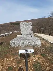 Near these two groups, there is a Roman Catholic cemetery where Šefik Bešlagić recorded 31 stećaks (29 chests and 2 sarcophagi), and now there are about a dozen of them. Most of them are in fragments, significantly damaged and sunken. Several stećaks were damaged during the construction of new tombs. When entering the cemetery by the road, there are three slab-shaped stećaks, one of which has sunk. Two stećaks were built into the fence wall of the cemetery, and three were placed outside it. Most of them are plate-shaped or undefined. Two sljemenjak tombstones (transl. gabled, also ridged or ridge-shaped tombstone), one of them with a pedestal, are the best preserved, and are located in the middle of the cemetery.[1][2]