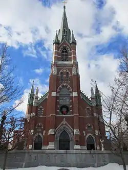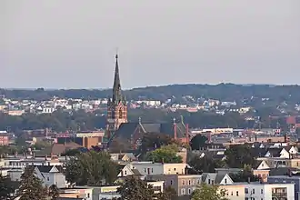 Ste. Marie Church is a Roman Catholic church on the West Side of Manchester, New Hampshire, in the United States. The church was founded to serve the needs of French-Canadian Catholic immigrants to New Hampshire. The Gothic Revival church building is a prominent feature on the Manchester skyline, and dominates the West Side skyline. The building is perched atop the plateau that makes up Rimmon Heights, and forms one of the focal points of the Notre Dame neighborhood, along with Lafayette Park across the street.