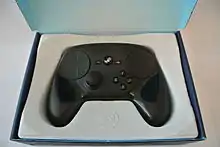 The Steam Controller was released in November 2015.[38] The Steam Controller was designed by Valve not only for games developed for controllers, but also for games traditionally played with keyboard and mouse controls. It features two high-resolution clickable touchpads (replacing the typical thumbsticks on modern console controllers), sixteen buttons, including face, shoulder, and undergrip buttons, and gyroscopic sensors for motion control. The touchpads include haptic feedback, which can send tactile feedback to the player in reaction to events within the game; Chris Kohler of Wired described using the controller while playing Civilization V at a press event at Valve, and noted that as he used the touchpad to move the mouse cursor, electromagnets within the controller created audio and tactile feedback as if he were using a trackball.[39] Although the controller was designed for the Steam Machine platform, it can also be used with Steam on existing PCs.[40]