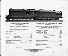The Reid-Ramsey turbine, built by the North British Locomotive Company in 1910, had a 2-B+B-2 (4-4-0+0-4-4) wheel arrangement. Steam was generated in a standard locomotive boiler, with superheater, and passed to a turbine generator. Exhaust steam was condensed and recirculated by small auxiliary turbine pumps.[9] The armatures of the motors were mounted directly on the four driving axles. It was later rebuilt as a direct-drive turbine locomotive as seen above.