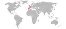 The spider is an introduced species across Europe, plus parts of North Africa, and likely spreading. It was found for the first time in 2011 in Cologne, Germany.[13] It is originally from the Canary Islands and Madeira.[14] In England it has been reported mostly in southern counties,[15][16] but its range was reported to be expanding northwards in the 21st century.[17] In 2011, the spider was reported as an established invasive species in the USA, in Ventura County, California.[18] In January 2016, it was reported that Steatoda nobilis had been found in Chile, the first time that the species had been recorded in the southern hemisphere.[19][20] Research published in December 2018 showed that it was also established in Colombia and Ecuador.[21] It is considered to be one of the world's most invasive species of spider.[10] Seaside cities and villages with a temperate climate are especially favourable habitats for S. nobilis.[22]
