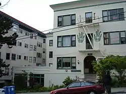 The Pierce's original house was a turreted Victorian, which they lived in as soon as they moved to the city of Berkeley in 1894. The Pierces sold the property in 1903 to move to a house up the street, and eventually to Cloyne Court. In 1927 the Pierce house was torn down to make way for Hotel Slocum.[6] In 1936, University Student Cooperative Association (now known as Berkeley Student Cooperative) leased the building to establish Stebbins Hall, a women's cooperative boarding house.[7] This was done with the help of the alumni of Mortar Board, the first national honor society for college senior women.[8][9][7] Beverly Cleary was one of the first residents of Stebbins Hall and referred to her time there as "two of the most interesting years of my life."[10][11] The Berkeley Student Cooperative purchased the property in 1950.