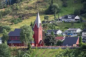 Stedje Church (Norwegian: Stedje kyrkje) is a parish church of the Church of Norway in Sogndal Municipality in Vestland county, Norway. It is located in the village of Sogndalsfjøra, near the shore of the Sogndalsfjorden. It is the church for the Stedje parish which is part of the Sogn prosti (deanery) in the Diocese of Bjørgvin. The red, wooden church was built in a long church design in 1867 using plans drawn up by the architect Christian Christie. The church seats about 400 people.[1][2]