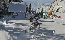 The game has a trick system, which allows players to perform special maneuvers such as spinning and grabbing while they are skiing or snowboarding. Players receive points if they perform tricks.[9] If the player performs excellently in a race, they will receive a medal as an award. When the player crashes during a challenge, they have the ability to retry it immediately[10] and view the amount of g-Force the player's character endured during the crash.[11] When players move around on the map, their path will be recorded automatically and can be viewed through entering the mountain mode. Players capture screenshots and view their own performance data.[5] These replays can be shared to the game's community and various social networking sites. Players can set and share their trail as a challenge for other players.[5] There are six types of play style ranging from racing, to exploring.