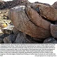 A steep structure is a unique structural feature found in the O'okiep Copper District (OCD), Namaqualand, Northern Cape Province, South Africa. These structures occur as narrow, east-west trending, antiformal and/or monoclinal zones of high strain characterised by the rotation of regional foliation into subvertical attitude.[2][3] These structures commonly host plug- and dyke-like mafic- to intermediate cupriferous bodies of the Koperberg Suite in their central portions.[4] Steep structures are interpreted to have formed at the same time as the granulite-facies metamorphism during the waning stages of the Namaqua Orogeny.[2][5] Steep structures are also intimately related to megabreccias, a term coined by geologists in the OCD for granite-gneiss and metasedimentary country rocks cemented by granitic material [6]
