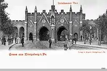 The northern Steindamm Gate (Steindammer Tor), the most architecturally impressive gate in the city walls, was dismantled in 1912 to allow further development in northern Königsberg, as Steindamm was one of the busiest thoroughfares in the city.[10] The arterial road connecting Steindamm and Hufen was known first as Kaiser-Wilhelm-Damm, then Hansaring in 1918, and then Adolf-Hitler-Straße in 1933.[10] Institutions located at the new square, Hansa-Platz (later Adolf-Hitler-Platz), included the Amtsgericht, Landgericht, and Polizeipräsidium.[10] Nearby was the Neues Schauspielhaus.
