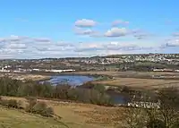 The site chosen for Stella North was the Newburn Haugh, which was the site of Lemington Hall.[7][nb 1] Lemington Hall was demolished in 1953 during the construction of Stella North.[9] Stella South was built on the Stella Haugh, the site of the Battle of Newburn in 1640. A cannonball from the battle was on display in the South station for many years, after having been dredged from the river bed.[10] Between 1887 and 1916, the Stella Haugh had been the site of the annual Blaydon Races,[2] which stopped after a riot broke out following allegations of race fixing.[11] Just before the construction of the South station the haugh had two uses. Blaydon Rugby Club's ground had been there since 1893, but in 1950 it was compulsorily purchased by the British Electricity Authority for £1,000. The club moved to a new ground in Swalwell, which it still uses.[12] Newcastle University Boat Club had owned a boathouse on the site since 1929, but in 1951 the British Electricity Authority requisitioned it, forcing the club to move upstream to its current location in Newburn.[13]