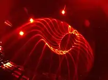 The obvious solution to this problem is to bend the tube around into a torus (a ring or donut) shape.[37] Motion towards the sides remains constrained as before, and while the particles remain free to move along the lines, in this case, they will simply circulate around the long axis of the tube. But, as Fermi pointed out,[lower-alpha 6] when the solenoid is bent into a ring, the electrical windings would be closer together on the inside than the outside. This would lead to an uneven field across the tube, and the fuel will slowly drift out of the center. Since the electrons and ions would drift in opposite directions, this would lead to a charge separation and electrostatic forces that would eventually overwhelm the magnetic force. Some additional force needs to counteract this drift, providing long-term confinement.[7][37]