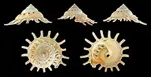 Stellaria solaris has 10-20 long, thin protrusions on its shell that allow it to lift itself off the bottom of the seafloor in order to graze.[2][3] These symmetrical, radial protrusions also make the shell structure more stable, as they make the effective shell area larger.[2] The shell is about 105 mm (4 in) in diameter with its protrusions.[2] It has been noted that the protrusions often make up about 45% of the shell’s diameter and protrude at 90 degree angles from the outside edge of the peripheral area of the shell.[4] Certain specimens have been described as having thick and high spires with an ovular shell opening.[5] The shell has a spire angle of 92-102 degrees, making it depressed.[4] The whorls and base of the shell are convex, and the shell is often a light yellow-brown color all over.[4] Fragments of the shells of snails that die accumulate and become shallow marine sediments.[6]