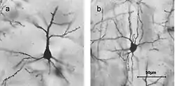 ![]() Golgi stained cortical neurons A) Layer II/III pyramidal cell B) layer IV spiny stellate cell | |