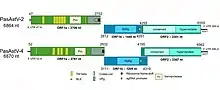 Astroviruses have a genome composed of a single strand of positive sense RNA. The strand has a poly A tail at the 3' end, but no 5' cap. With the exclusion of polyadenylation at the 3' end, the genome is between 6.8–7.9 kb long. The genome is arranged into three open reading frames (ORFs), with an overlap of approximately 70 nucleotides between ORF1a and ORF1b. The remaining ORF is known as ORF2.[14] ORF2 encode the structural proteins, which are -at least- VP26, VP29 and VP32, the most antigenic and immunogenic of these being VP26. This protein is probably involved in the first steps of viral infection, being a key factor in the biological cycle of astroviruses.[15] The human astrovirus genome mutation rate has been estimated to be 3.7×10−3 nucleotide substitutions per site per year with the synonymous changes rate of 2.8×10−3 nucleotide substitutions per site per year.[16] The capability for genetic recombination appears to be present in type-3 and type-4 human astroviruses,[17][18] and in porcine astrovirus strains.[19]
