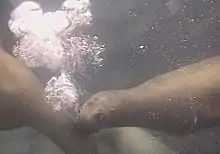 Like most otariids, Steller sea lions are vocal in air. Mature male sea lions have a range of vocalizations as part of their territorial behaviors, including belches, growls, snorts, and hisses that serve as warnings to others. Both males and females also produce underwater noises similar to their above water sounds, described as clicks, barks, and belches.[36] The primary function of their vocalizations is for social behavior. Sonogram readings reported that Steller Sea Lions make discrete, low frequency pulses underwater that resemble the male "belching" territorial noise made in air. These underwater vocalizations have an average of 20–30 pulses per second.[37]