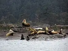 Steller sea lions tend to live in the coastal waters of the subarctic because of the cooler temperate climate of the area.[14] Like all otariids, Steller sea lions are amphibious and spend some time in water and some on land.[15] Typically, Stellar sea lions spend their time in the water feeding but haul-out onto land to reproduce, raise their pups, molt, and rest.[16] Steller sea lions usually congregate on isolated islands because they are the ideal terrestrial habitat. These isolated islands are preferred by Stellar sea lions because they can avoid predation from terrestrial predators, easily thermoregulate (by means of cooling winds), and access offshore prey more easily.[15] Some haul-out sites, known as rookeries, are commonly used for reproduction while other haul-out sites are used for other purposes like molting.[17] However, both biotic and abiotic factors can influence the amount of time that Steller sea lions spend on land. Haul-out sites and haul-out abundance of the Steller sea lion can be determined by prey availability, predator abundance, tide levels, weather, etc.[17]
