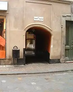 Stenbastugränd is a small alley in Gamla stan, the old town in central Stockholm, Sweden. Connecting Västerlånggatan to the square Brantingtorget, it forms a parallel street to Kolmätargränd and Storkyrkobrinken.