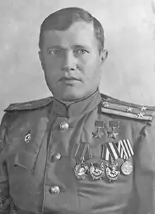 Stepan Fyodorovich Shutov (Belarusian: Сцяпа́н Фё́даравіч Шу́таў, Russian: Степан Фёдорович Шутов; 30 January 1902 – 17 April 1963) was a Red Army Colonel and double Hero of the Soviet Union. Shutov fought in the Russian Civil War and the Polish–Soviet War. He was demobilized after recovering from Typhus in 1921 but was drafted into the Red Army again in 1924. He initially served in cavalry units and later became an officer in the tank troops. When Germany invaded the Soviet Union, Shutov was a tank battalion commander. He fought in the Battle of Moscow. In December 1941, he became deputy commander of a tank brigade and in August 1942, was given command of the 187th Tank Brigade of the 9th Tank Corps. Shutov was appointed commander of the 50th Separate Guards Tank Regiment in October. From May 1943 he took commanders courses at the Military Academy of the Mechanization and Motorization of the Red Army. After graduation Shutov became commander of the 20th Guards Tank Brigade in August 1943. For his leadership of the brigade in the Battle of Kiev (1943), he was awarded the title Hero of the Soviet Union. During the Second Jassy–Kishinev Offensive the brigade captured Ploiești. For his leadership Shutov was awarded the title Hero of the Soviet Union a second time. In September 1944, he became 9th Guards Mechanized Corps deputy commander but a few days later was seriously wounded, resulting in the amputation of his arm while in the hospital. He retired in September 1945 and later became deputy minister for social welfare of the Belorussian SSR.[1]