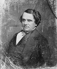 He was born Stephen Arnold Douglass in Brandon, Vermont,[1] on April 23, 1813, to physician Stephen Arnold Douglass and his wife, Sarah Fisk. The younger Douglas would drop the second "s" from his name in 1846, the year after the publication of Frederick Douglass's first autobiography; it is unknown if these two events were connected.[2] Douglas's paternal ancestors had migrated to New England in the 17th century, and his paternal grandfather, Benajah Douglass, served several terms in the Vermont House of Representatives. Douglas's father died when Douglas was just two months old. Douglas, his mother, and older sister moved to the farm she and her bachelor brother, Edward Fisk, had inherited from their father.[3] Douglas received an elementary education at the local school in Brandon. As a teenager, Stephen left the family farm for Middlebury, Vermont, and apprenticed himself to a cabinetmaker named Nahum Parker. He began reading political literature and engaging in discussions with his employer and other young men. Douglas came to have great admiration for Andrew Jackson. He left Middlebury and returned to Brandon after he grew dissatisfied with his employer. He began another apprenticeship with another cabinetmaker, Deacon Caleb Knowlton, but also quit this employer after less than a year.