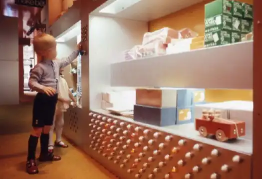 In response to his growing focus on play and toys and the effects of toys on the development of children and what kind of adults they became, he had already established the renowned toy store toy store at the corner of Greenwich and SeventhAvenue, 1•2•Kangaroo. In this store, somewhat resembling a slice of pie with an original Art Deco facade, he sold unusual toys, both antique and modern. He held the exclusive rights to import toys by such distinguished designers as Lis and Kurt Naef, Peer Clahsen, and Patrick Rylands.
