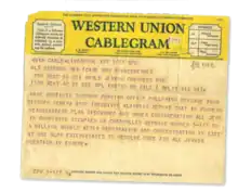 Riegner asked that Stephen Wise be made aware of the cable's contents. But U.S. State Department officials did not pass it along.[21] Wise was not informed about the telegram until Riegner sent him another cable directly, almost three weeks later, on August 29. "Received alarming report," the cable read, "that in Fuhrers headquarters plan discussed and under consideration all Jews in countries occupied or controlled Germany number 3-1/2 to 4 million should after deportation and concentration in east should at one blow exterminated to resolve once for all Jewish question in Europe." This was precisely the plan that the Nazi regime was putting into motion.