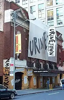 By December 2000, The New York Times described the Henry Miller as being dilapidated, with dangling wires in the ceiling and a "carpet is so grubby that patrons are allowed to drink their Weissbier in the theater".[136] Around that time, the theater was rechristened the Henry Miller and was renovated with 640 seats and a new air-conditioning system.[137] After multiple delays, including a delay caused by the September 11 attacks, Urinetown opened in September 2001,[138] running for two years.[139] By late 2003, Durst was planning to develop a new skyscraper on the site in conjunction with Bank of America. Durst notified the theater's operators that the Henry Miller's would have to be closed and demolished to make way for the construction of the 55-story Bank of America Tower.[140] The original theater closed in January 2004.[141]