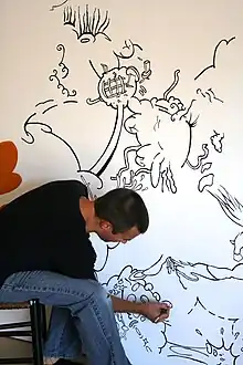 His work has appeared in publications including LA Weekly,[5] Raw Vision Magazine, Monopol Magazin,[6] New American Paintings[7] and Juxtapoz. Some of his work was published in the book BLK/MRKT TWO[3] by Die Gestalten Verlag and in Year One Rewind, a survey of urban and graffiti art by Last Gasp Press.