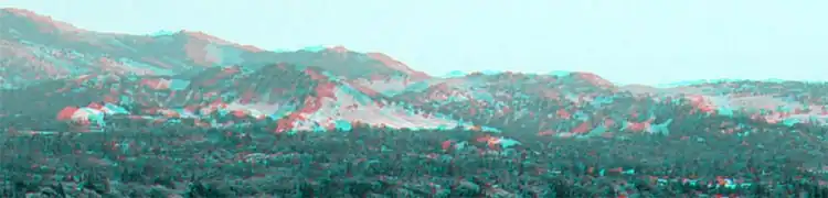 In the red-cyan anaglyph example to the right, a ten-meter baseline atop the roof ridge of a house was used to image the mountain. The two foothill ridges are about four miles (6.4 km) distant and are separated in depth from each other and the background. The baseline is still too short to resolve the depth of the two more distant major peaks from each other. Owing to various trees that appeared in only one of the images the final image had to be severely cropped at each side and the bottom.