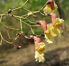 Stereospermum tetragonum, the yellow snake tree, is 15–20 m tall, trunk 15–25 cm in diam, large leaves 25–50 cm; leaflets 3–6 on each side of midrib, long elliptic, 8-14 X 2.5–6 cm. Large, pale yellow, trumpet shaped flowers occur in panicles. Flowers are pale yellow, slightly curved, about 2 cm, upper lip 2-lobed, lower lip 3-lobed, tomentose at mouth, tube terete. The fruit is long, 4-angular, slightly curved, 30–70 cm, about 1 cm in diameter. This, probably, is the source of its common name, snake tree.