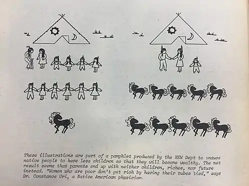 The decline in birth rate was a quantifiable effect, however, sterilization impacted many Native American women in non-quantifiable ways as well. Within Native American culture a woman's fertility is greatly valued, leading to psychological and social consequences from sterilization. For a woman to be unable to bear children would cause shame, embarrassment and possible condemnation from the individual's tribe due to how Native American peoples view motherhood.[18] In 1977, lawyer Michael Zavalla filed a case with Washington State after three Cheyenne women from Montana were sterilized without their consent.[18] However, the sterilized women remained anonymous because they feared tribal repercussions. As Marie Sanchez, Chief tribal judge for the Northern Cheyenne Reservation, explained, "even more discouraging than high legal bills is the risk of losing one's place in the Indian community, where sterilization has particular religious resonance."[18] In some areas, the sterilization procedure was insufficiently sterile, which led to complications. When complications arose, additional medical treatment was required, but government funding only covered the procedure itself. Because most women could not afford follow-up medical care, in many cases they did not receive it, and some died as a result.[18] Marie Sanchez equated the mass sterilization of Native Americans as modern genocide.[24]