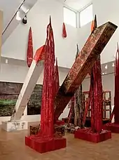 The artist has created a series of large, poured urethane sculptures, collectively titled Monument Stalagmites, in blood red, intense blacks, and other vibrant colors. These sculptures, which can be up to eighteen feet tall, resemble the stalactites and stalagmites that can be found in caves. The pieces are created by the accumulation and pouring of a quick drying poly-urethane over an underlying armature. The pieces are presented on bases and have a wooden buttress, often inscribed with text, that the artist refers to as a crutch. They have been described as monumental gestures and reflect the artist's declared intention to depict the moment when malleability becomes frozen.[8]