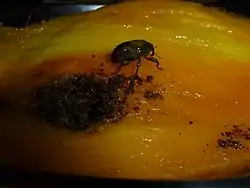 The colour varies and they may be covered with black, greyish, reddish or yellowish scales. In Australia adult weevils are dark brown to black with grey markings. When disturbed, adults press their legs to the body, and fit their beak into a ventral groove. Females have an elevated ridge at the pygidial apex while it is rounded in the male. The adults are not strong fliers and are not found far from fallen fruit. New areas are infested by human transport of infested fruit. Eggs are elongated and creamy white and covered by a protective brown coating with two tiny tails at one end. It is widespread and occurs in most countries especially where mangoes are grown. The adult female lays eggs on the surface of the mango fruit. Larvae and pupae develop inside the fruit and adults emerge, cutting their way out of the seed and pericarp after the fruit falls and decays.[2] Adults enter a diapause until the next fruiting season. Mango seed weevil is considered a pest on mangoes.[3][4]