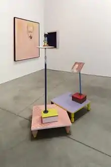 Locke’s art explores the meaning applied to male portraiture. His works comprise several portraits of men - for almost a decade, he has reworked the particular gesture of a man with his tongue hanging out of his open mouth. "It’s hard to make a painting of a man and not have him look important. So I came up with this weird gesture," Locke explained in an interview with the Institute of Contemporary Art, Boston. "I like that they’re not heroic, and not attached to any body,"[3] he said of his pieces, which straddle the line between sculpture and painting. "They’re floating around in the atmosphere, waiting to possess somebody, or get inside your head and transform you." He aims to "make paintings of men who were vulnerable, or exposed, without using the obvious trope of nudity."[4] His work provokes broader social, sexual and art historical conversations.