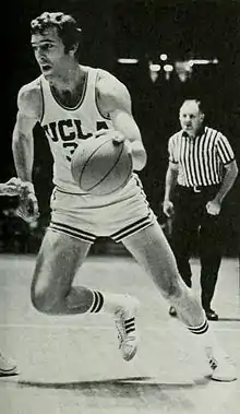 In 1969–70 he was joined in the starting lineup by four other future NBA players, forwards Sidney Wicks and Curtis Rowe and guards Henry Bibby and John Vallely. For the season he averaged 12.5 points and 10.0 rebounds per game, with a field goal percentage of .496 and free throw percentage of .741.[7] He scored 17 points as UCLA defeated Jacksonville University 80–69 in the 1970 NCAA championship game.[8] After the season, UCLA honored him with the J.D. Morgan Memorial Award presented by the Bruin Hoopsters for the outstanding "team player."[9]