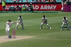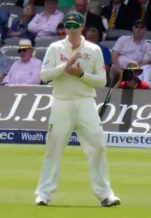 Smith made his Test debut at Lord's in July 2010, playing both Tests against Pakistan in the 2010 Test series played in England.[20] He was selected mainly for his bowling, and batted down the order, although his bowling was not required in the first innings. In the second innings, he took 3 wickets for 51 as Australia won by 150 runs.[70] In the second Test he was called to bowl only ten overs and took no wickets, although he played an impressive role with the bat in the second innings. Batting with the tail, he scored 77 including nine fours and two sixes off successive balls, helping Australia to set a competitive target after having been bowled out for 88 in the first innings.[71]