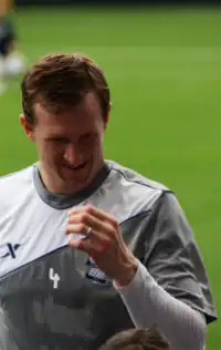He made his debut for the club on the opening day of the 2011–12 Football League Championship season, playing the whole of a 2–1 defeat at Derby County.[157] He came close to opening the scoring in the Europa League play-off round first leg against Portuguese club Nacional, the first time that Birmingham had participated in major European competition for nearly 50 years, when his placed header struck the foot of the post.[158] In the return, Caldwell helped the club beat Nacional 3–0 advance to the Group Stage.[159] Since making his debut for Birmingham City, he quickly became a first team regular, forming a centre–back partnership with Curtis Davies.[160] Caldwell then helped the club keep four consecutive clean sheets between 16 October 2011 and 29 October 2011.[161] His performance was praised by Manager Chris Hughton for his dedication and commitment to the team.[162] In return, he praised his philosophy, comparing it to his former manager Owen Coyle and even going far as to say "the best sort of manager to play for".[163] Caldwell also captained Birmingham City's matches in the UEFA Europa League group stage, as they were eliminated.[164][165] He successfully predicted that if the club failed to qualify for the Europa League knockout stage, it would be a disappointment.[166] Once again, Caldwell helped the club keep four consecutive clean sheets between 14 January 2012 and 28 January 2012.[167] In the absent of Stephen Carr and Liam Ridgewell, he captained Birmingham City for the rest of the 2011–12 season.[168] Caldwell stated on two occasions that the club can win the promotion back to the Premier League.[169] However in a match against Ipswich Town on 17 April 2012, he suffered a groin injury and was substituted in the 35th minute, as Birmingham City drew 1–1.[170] After the match, it was announced that Caldwell was sidelined for the rest of the 2011–12 season.[171] He previously missed a match against Watford on 28 August 2011.[162] Caldwell's groin injury was considered to be a loss among the club's supporters, considering his contribution he has done this season so far.[172] However in his absence, Birmingham City lost 3–2 against Blackpool in the semi–finals of the Championship play–offs.[173] At the end of the 2011–12 season, Caldwell went on to make fifty–two appearances in all competitions.