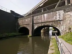 The Stewart Aqueduct (or Steward Aqueduct) in Smethwick, West Midlands (but formerly in Staffordshire), England carries the BCN Old Main Line Canal (1770) over the BCN New Main Line Canal (1828).[1] Alongside and above the New Main Line Canal is the Stour Valley section of the West Coast Main Line (1852), all three being bridged by the M5 motorway (c. 1970).[1]