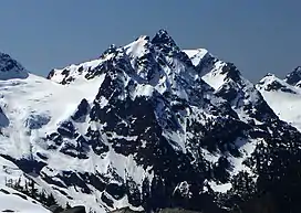 During the Pleistocene period dating back over two million years ago, glaciation advancing and retreating repeatedly scoured the landscape leaving deposits of rock debris.[4] The "U"-shaped cross section of the river valleys are a result of recent glaciation. Uplift and faulting in combination with glaciation have been the dominant processes which have created the tall peaks and deep valleys of the North Cascades area.