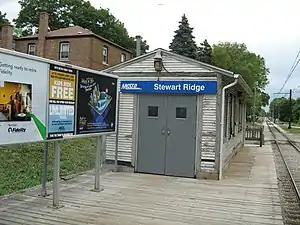 Stewart Ridge is a commuter rail station along the Blue Island Branch of the Metra Electric line in the West Pullman neighborhood of Chicago, Illinois. The official address, according to Metra is Stewart Ridge, South of 120th Place. The actual location is between Stewart Avenue and Harvard Avenue, halfway between 120th Street and 122nd Street, which is 16.1 miles (25.9 km) away from the northern terminus at Millennium Station.[2] In Metra's zone-based fare system, Stewart Ridge is in zone C. As of 2018, Stewart Ridge is the 228th busiest of Metra's 236 non-downtown stations, with an average of 19 weekday boardings.[1]
