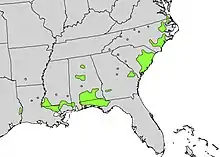 Stewartia malacodendron is native to Texas, where it is rare, being found in a small area along Little Cow Creek near Burkeville, growing at the sides of streams, ravines and wooded bluffs in well draining soils. It is also found in scattered locations in the states of Arkansas, Georgia, Florida (panhandle region), Louisiana and southern Alabama and as far north as Virginia.[8] This tree species is listed as endangered in the US states of Arkansas and Florida.[2]
