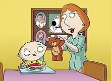 Meanwhile, Stewie plays at the park with his teddy bear, Rupert. A vicious dog grabs Rupert from him and tears it to shreds. Lois runs after the dog, retrieves Rupert, and repairs him, causing Stewie to rethink all the bad thoughts he has had of Lois. Stewie becomes enamored with her, which she takes as refreshing at first, but eventually, she becomes exhausted and frustrated at his increased dependency and even has a nightmare of murdering him. Taking Brian's advice, she starts ignoring his demands for attention until he injures himself by falling down the stairs; Lois tries to apologize for her behavior, but Stewie is so disgusted by it that it causes him to hate her once again.[2]