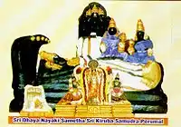 It is believed that Garuda, the eagle vehicle of Vishnu, does not fly over this place. Once, Garuda and Adishesha (the snake on whom Vishnu rests in his abode, Vaikuntha) got into an argument as to who was more powerful and devoted to their lord. Finding Garuda a little arrogant, Vishnu went in favour of Adisesha. Worried that Garuda might be angered at this, Adishesha sought the protection of Vishnu, upon which Vishnu asked him to roll himself and hide under him. It is said that as a result of this anger, Garuda never flies over this place. There is another legend that Adishesha won the argument and since snakes were sworn enemies of eagles, Adishesha hid himself under the waters of the temple tank. It is henceforth believed that devotees will be relieved of Naga Dosham (affliction due to serpent god) if one visits this temple. Unmarried people and childless couple can also visit this temple for salvation.[2]