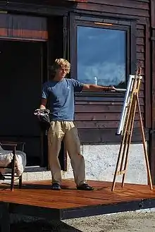 He has formal background from Kunstskolen i Bergen (The Art School in Bergen),[2] Merkantilt Institutt (MI) i Bergen, and Tegne-og maleskolen i Bergen (Bergen Drawing and Painting School), Norway. After finishing formal education he independently studied the old masters such as Leonardo da Vinci, Titian, Caravaggio, Rembrandt, Johannes Vermeer, Diego Velázquez, Goya and J. M. W. Turner.[3] Within a Norwegian context the mystical landscape visions created by Lars Hertervig has been closely examined.[4][5] As a creator of pictorials Stian has performed for the last 20 years, and has been purchased by Mayor`s office and Council chambers municipality of Strand, Norway.[6] The artist has in recent years simplified his paintings to achieve a more monumental expression.[7] Stian Heimlund Skjæveland has his own gallery in a small former shipyard[8] in Jørpeland Norway.[9]
