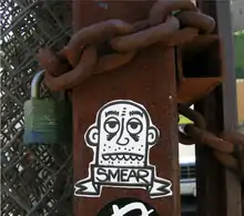 Sticker art (also known as sticker bombing, sticker slapping, slap tagging, and sticker tagging) is a form of street art in which an image or message is publicly displayed using stickers. These stickers may promote a political agenda, comment on a policy or issue, or comprise a subcategory of graffiti.[1]
