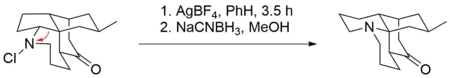However, there also have been reported examples of base-free Stieglitz rearrangements of N-halogenated amines. An example for that can be found in the total synthesis of (±)-lycopodine by Paul Grieco et al.[6][29] There, a ring formation takes place by a rearrangement on a secondary haloamine by subjecting it to silver tetrafluoroborate.[6] AgBF4 is known to act as a source of Ag+ ions that can facilitate the dissociation of halides from organic molecules, with the formation of the respective silver halide as a driving force.[30] The desired product is then obtained by reduction with sodium cyanoborohydride, a mild reducing agent which is commonly employed in the reduction of imines to amines.[31]