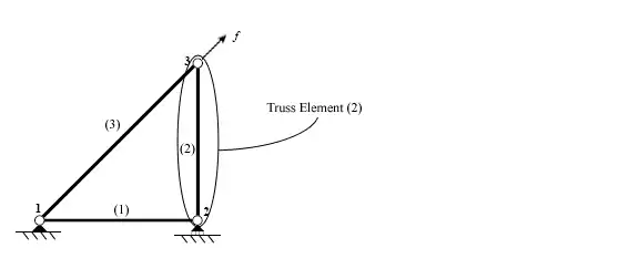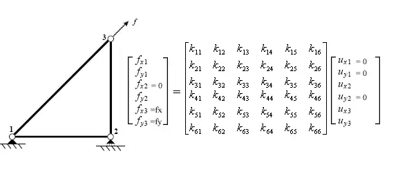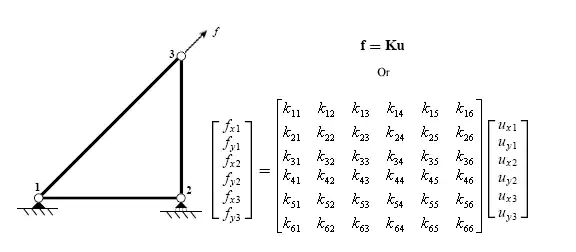 A truss element can only transmit forces in compression or tension. This means that in two dimensions, each node has two degrees of freedom (DOF): horizontal and vertical displacement. The resulting equation contains a four by four stiffness matrix.