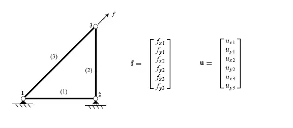 where and are the direction cosines of the truss element (i.e., they are components of a unit vector aligned with the member). This form reveals how to generalize the element stiffness to 3-D space trusses by simply extending the pattern that is evident in this formulation.