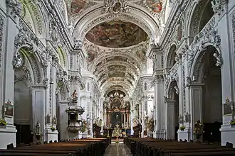 The decoration of the interior involved artists from various parts of Europe including Giovanni Battista Carlone who created the stucco works and Jakob Steinfels from Prague who painted the frescos.[3] Those on the ceiling of the choir depict scenes of the legendary founding of the monastery Waldsassen.