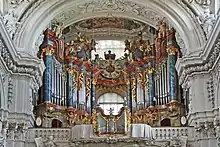 The main organ was built in 1738 by Johann Konrad Brandenstein.[3] From 1975 to 1976, E. Pfaff the organ was extensively rebuilt in the rococo housing. From 1982 to 1983, Georg Jann (Laberweinting) built new organs in the choir. From 1988 to 1989, Jann rebuilt all three organs after plans by Günther Kaunzinger, using partly the old pipes. In 1992 to 1993, two consoles were installed, both with six manuals, one on the gallery, and a movable one in the nave. The main instrument has 141 ranks, 101 stops and 7,720 pipes.[5][6]