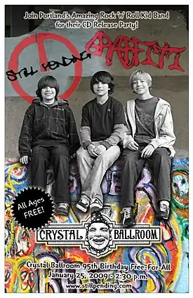 Still Pending were an American punk children band, formed in Portland, Oregon, United States, in 2005. The band originally comprising three young musicians, Reed Gulick-Stutz (guitar and vocals), Grant Ellman (drums and vocals), and Ian Rogers (bass guitar). In June 2007, Rogers left the band and was replaced by Andrew Turel in August 2007.[1] It is rumored that the band broke up due to drummer and vocalist Grant Ellman embarking on a Jamaican Patois vocalism and lyric training course, leaving little time for him to perform his band duties because of the intense training schedule. The official website is currently down, and their social media is inactive currently.