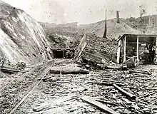 | Cascade | 83 mi 76 ch (135.1 km) | 18 November 1943 | 18 August 1958 | 30 m (98 ft) | ![]() First Cascade coal train in 1927. The locomotive is now preserved at Westport (see below) The line was extended 2 mi 65 ch (4.5 km) from Te Kuha[49] to serve the mine. In May 1910, 6 contracts were let, plus 18 in May 1911, extending the line from Te Kuha, to near Sinclair's Castle,[193] 10 mi (16 km) from Westport.[255] In 1915, during the war, the government announced no more work would be done.[263] Except for the bridges, most of the line had been built by 1916.[255] It had been hoped that work to 12-Mile would be done during 1914.[264] Work restarted in 1924, when the mine was being prepared.[265] In 2 years, the formation to Cascade Creek had been finished, ballasting and platelaying had reached Little Cascade Creek, 36 ch (720 m) from Cascade and other bridges were nearly complete, with a 5 acres (2.0 ha) ballast-pit used as aggregate for the concrete piers of the bridges.[266] The first coal train left Cascade, after a formal opening on 20 July 1927,[267] carrying about 175 tons.[268] The mine is at the south end of the Denniston Plateau, and just east of the Escarpment mine. It became a State Mine in 1948. Bathurst Resources bought it in 2010 and started open cast mining of semi-soft coking coal. In May 2016, the mine was placed on care and maintenance, when Westport cement works closed. The site should be fully rehabilitated in 2022/3.[269][270]![]() Cascade Creek bridge in 1939