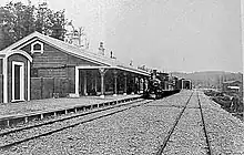 ![]() Taipo-iti, then called Reefton, was terminus of the line from 1892 to 1907 The original Reefton station opened on the south bank of the river on 29 February 1892,[143] when the line was extended from Tawhai. It was the terminus of the line for over 15 years, with a large goods shed and was described as a, "very handsome passenger station, dadoes and ceilings lined with linoleum, with appropriate wall papers between".[120] In 1891 it had been known as Devil's Creek.[49] In 1900 Reefton had a stationmaster in a special 80 ft (24 m) x 18 ft (5.5 m) building, with a verandah for its full length of the platform and a porch at street entrance. It had a booking-office, luggage-room, public lobby, ladies' waiting-room, telephone, coal-store, guards' and lamp rooms and was made in sections to allow for removal. It stood on a 200 ft (61 m) wood and earth platform. There were also toilets, 80 ft (24 m) x 30 ft (9.1 m) goods shed, with overhead crane, a loading bank, 80 ft (24 m) x 18 ft (5.5 m) engine-shed[116] (moved from Māwheraiti),[144] oil and coal stores, an office, stationmaster's house, two platelayers houses, outhouses, two portable huts and 75 ch (1.5 km) of sidings, with a triangle to turn engines.[116] On 13 May 1907 the terminus was replaced by Taipoiti, a new flag station,[145] also known as Little Devil,[146] which was to the south.[50] The name Taipo-iti was approved on 30 August 1906.[49] It was an approximation of Māori words meaning Little Devil, a name given to a local stream by gold miners.[121] It was a 5th class station, with shelter shed, platform and cart approach. Taipo-iti closed on 15 November 1959.[49] Only a single line remains.[61]